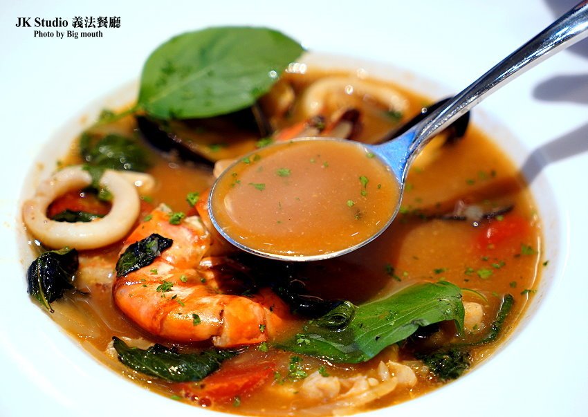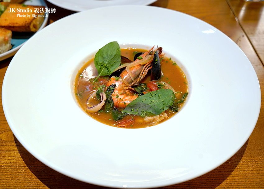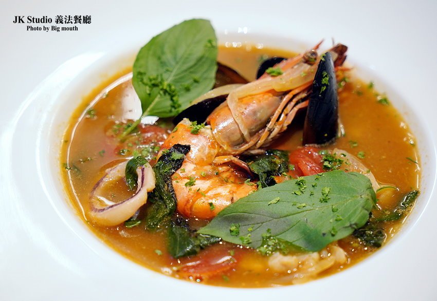 ▼這道是單點的馬賽海鮮湯,裡頭有草蝦、中卷、淡菜、魚肉、小番茄、洋蔥等配料,再加上九層塔提味,看起來料多實在!