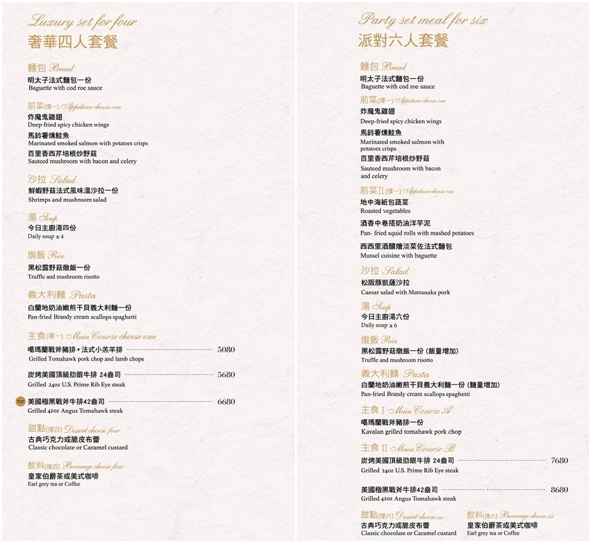 ▼菜單,我們這次享用的是頂級牛排4人套餐,如果需要湯品、甜點、飲料的話改點奢華套餐就能一次滿足!(詳細菜單請點我)