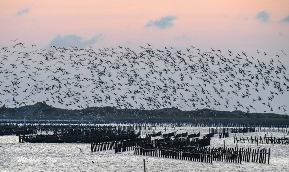 而且每年冬天黃昏傍晚會有數以萬計的冬候鳥「黑腹燕鷗」飛來北門潟湖的蚵棚這裡覓食,又是另一種風景,喜歡拍鳥類的朋友別錯過這場盛會。不過想拍要記得帶長焦段,普通焦段或手機就只能拍到很多黑點哈哈。(上圖借用自鹽鄉民宿餐廳粉絲團