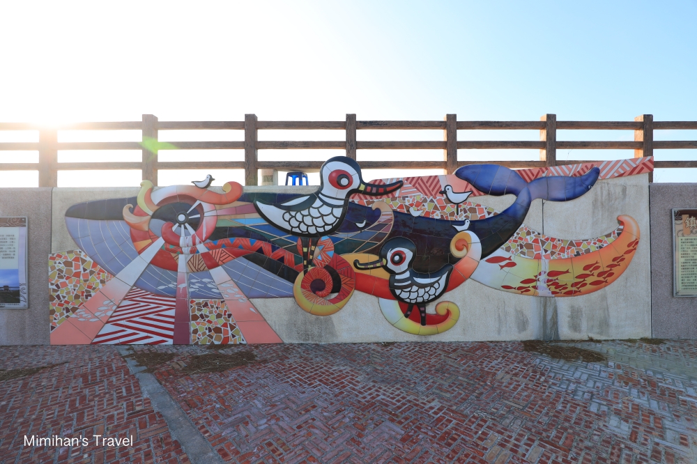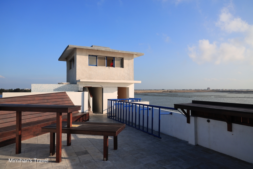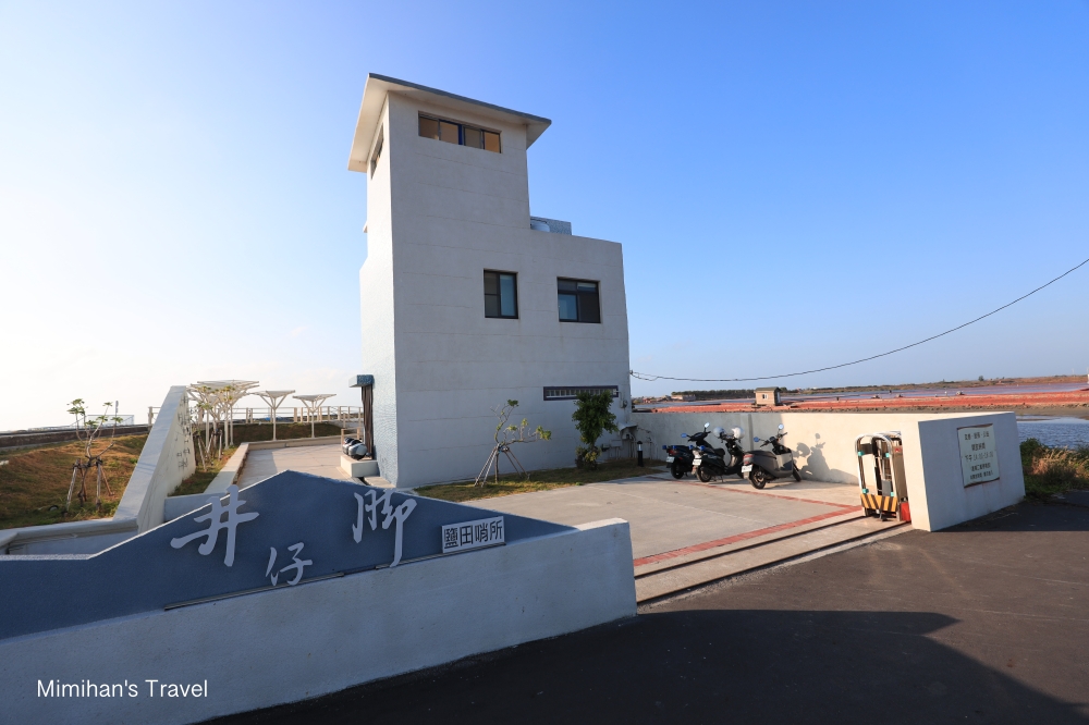 面對鹽田的左邊,會看到堤防上有幢白色建築,這座「井仔腳鹽田哨所」剛於2021年重新原址改建完成,部分開放參觀,遊客們可以在一樓拍拍裝置藝術,或走到3樓眺望整片井仔腳鹽田和北門潟湖的景色。