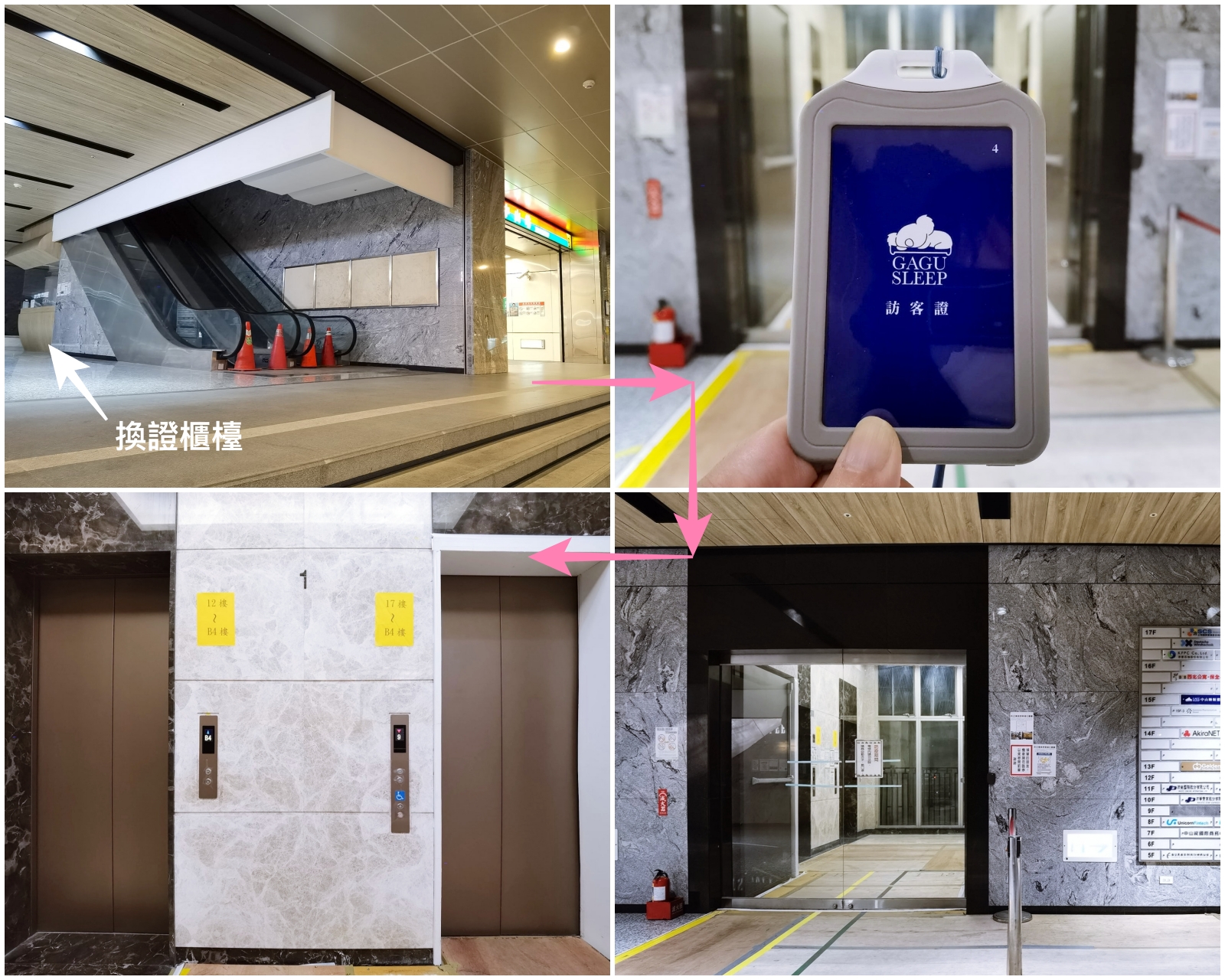 ▼ GAGU SLEEP 台北中山睡眠體驗店位置在台北捷運中山站 6 號出口走出來右轉的「皇翔中山」大樓,進入後要前往箭頭處換證櫃檯換證,告知人員說要到15 樓 GAGU 中山睡眠體驗店,並把證件押在櫃檯,方能取得訪客證後刷門禁上樓,上樓前要搭對電梯,15 樓要特定的電梯才有停。