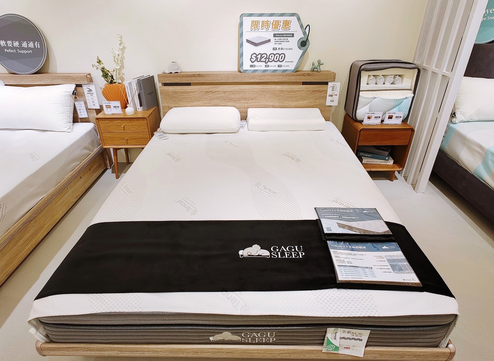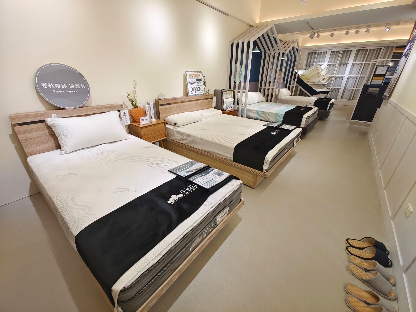 ▼最左邊的單人床是偏硬的天絲舒眠床,由於天絲舒眠床售價不會太高,又具備大眾很需要的吸濕性、抗菌防螨等特點,是暢銷的國民款床墊。