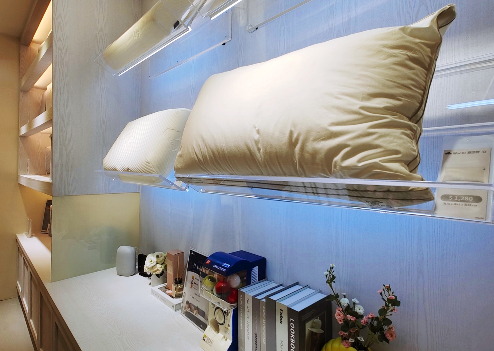 ▼GAGU SLEEP 台北中山睡眠體驗店除了展售床墊,也有販售床架、枕頭、床頭板。床頭板能自行搭背布料,有為鏟屎官們準備的歐洲貓抓布系列。