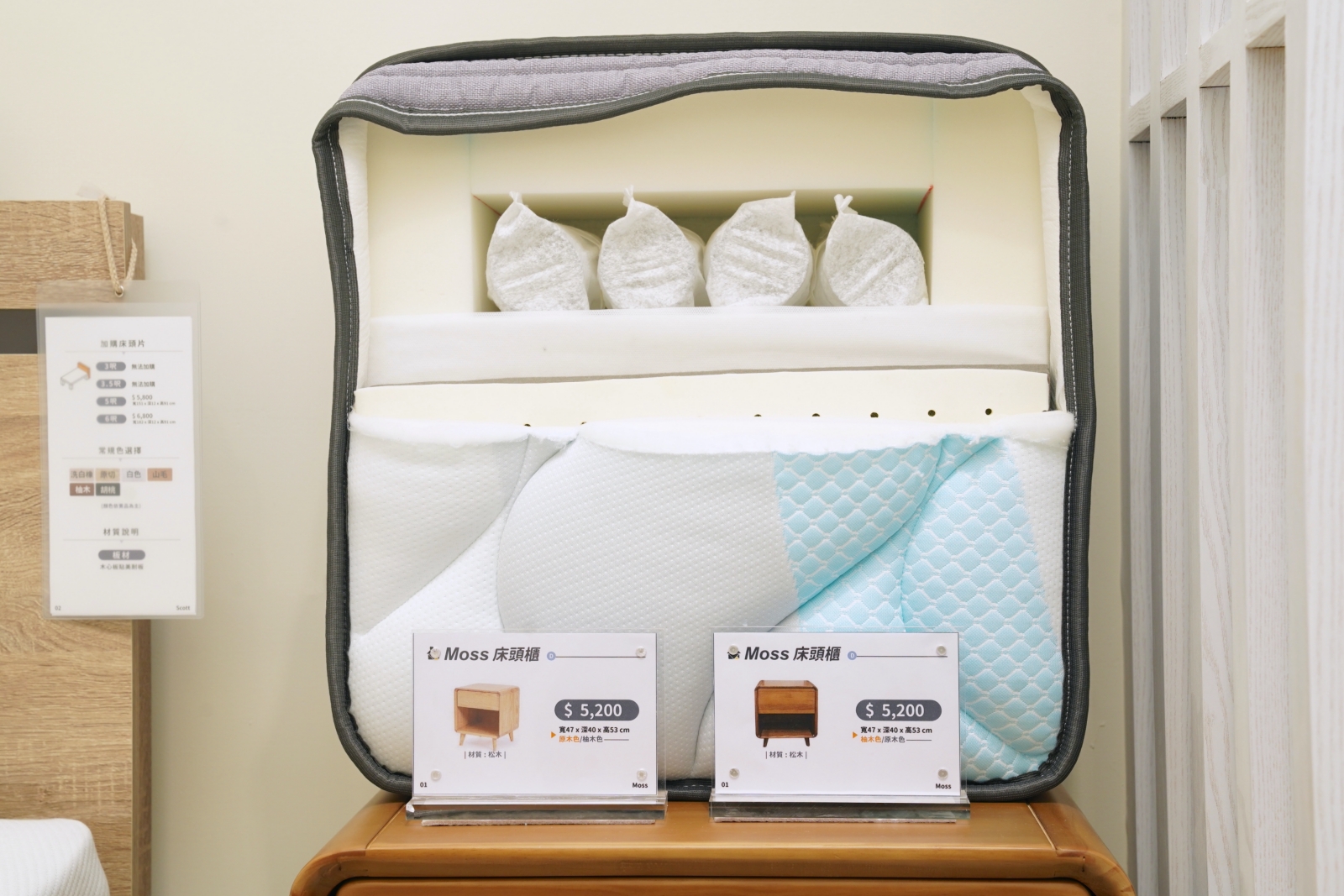 ▼NoHaChum 山寧泰防蟎床的材料亦有「木漿纖維」,讓皮膚得到很好的觸感跟吸濕性,親膚又舒適。很喜歡逛 GAGU 的其中一個原因是,這裡都會配成一套完整的床組寢具,像是床頭板、台灣製床架、床頭櫃、床底,來逛時就能順便參考如何搭配、購買。床頭板、床底、床架按照不同尺寸不同計費。