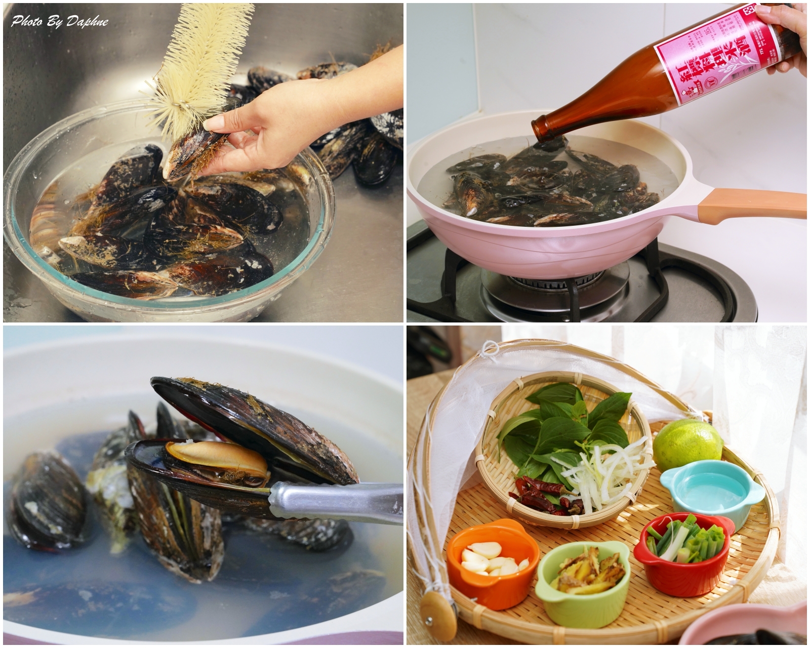 ▼清洗淡菜的過程中不需要吐沙,而是刷洗外殼後下鍋煮熟,過程中滴入一些米酒,燙熟後就可進入料理流程。當收到的淡菜無法一次吃完,也可以一起下鍋燙熟後,等到淡菜開殼挖出淡菜肉分裝冷凍,下次要煮的時候再解凍使用。
