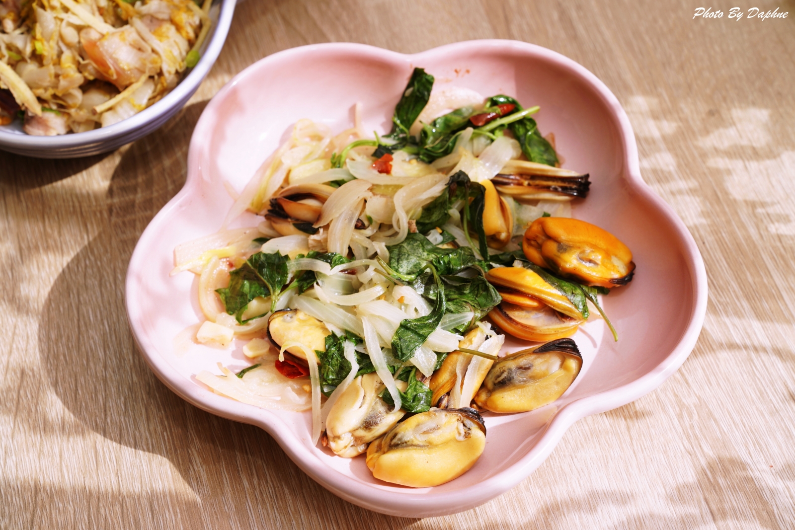 ▼這次將淡菜煮成三道料理,九月去馬祖時比較沒吃到用熱炒的淡菜,因此就來試驗一道香炒淡菜。把薑絲、辣椒、蒜末爆香,洋蔥拌炒至半透明。再放入淡菜,大火拌炒至開口,接著加入米酒,增加香氣,最後起鍋前,再加入九層塔拌炒,口味重的人加重調味就變成下酒菜。