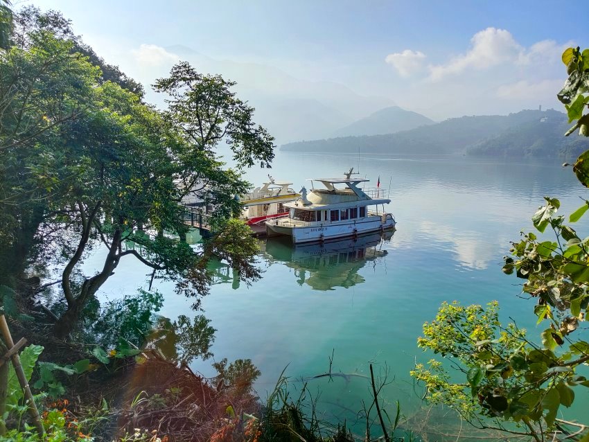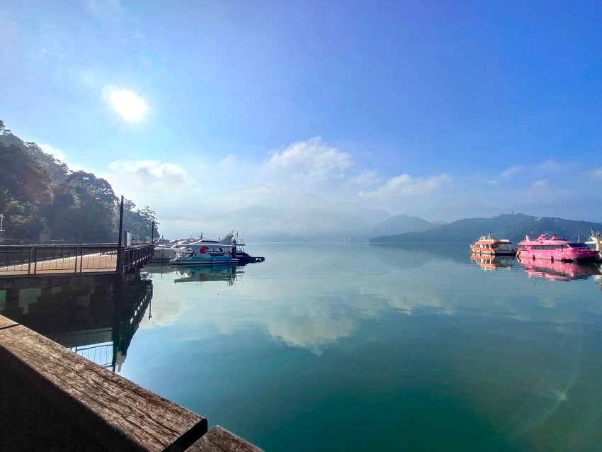 ▼我們一大早約莫七點出頭就開始走,大口覺得日月潭晨間最美了~~很適合早起來散步,尤其最近水位高漲,遠山近水搭配平靜無波的湖面,加上停泊的船隻,拍起來超有意境啊!