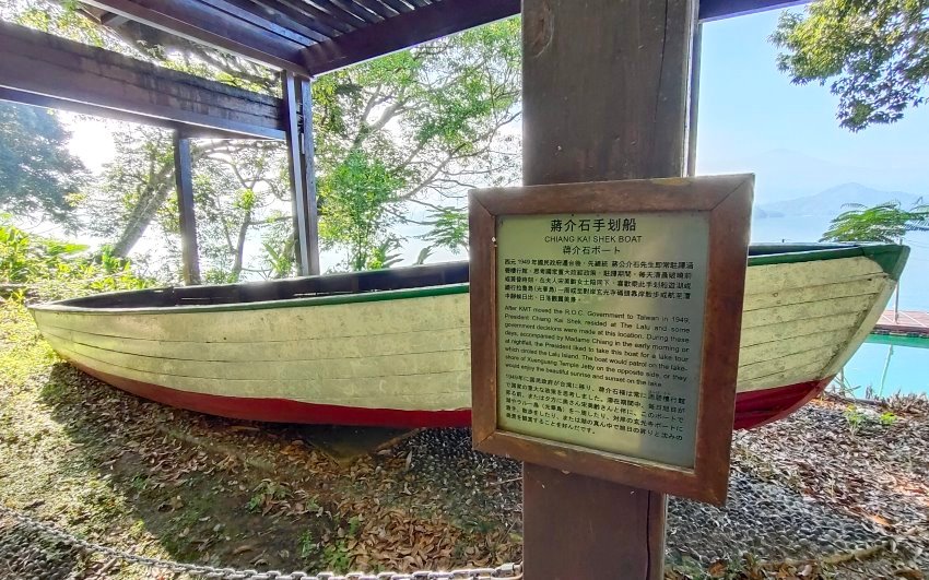 ▼走沒10分鐘就慢慢接近蔣介石碼頭啦!一旁還有展示蔣介石手划船,據說蔣介石以前還會跟夫人宋美齡一同划著手划船,繞行拉魯島(光華島)一圈,或是到對岸玄光寺碼頭散步,或是到湖中欣賞日出、日落美景~~現在則是歷史文物的展示,讓人更能了解當年的情景!