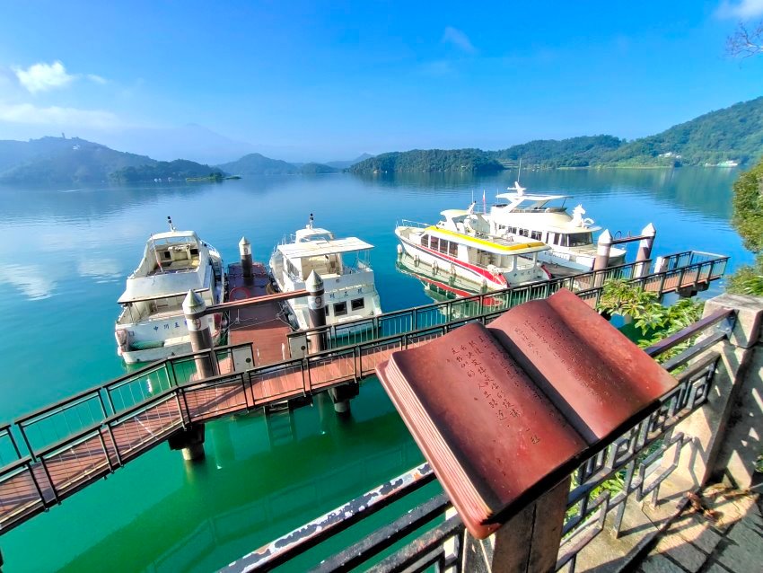▼這一條「涵碧步道」也是「涵碧文學步道」,由南投縣文化局跟日月潭國家風景區特別規劃,邀請岩上、向陽等12位國內文壇作家,創作短文或十行詩,在步道沿邊以書冊或是碑牌呈現,增添不少詩情畫意與浪漫情懷!從這個角度拍下去也超級漂亮,整個湖面彷彿被群山包圍,靜謐又美好!