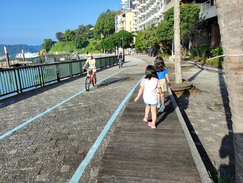 ▼「涵碧步道」全長約1.5公里,起點位於梅荷園,途中會經過幾個不錯的拍照景點,像是耶穌堂、蔣公涼亭、蔣介石碼頭、育樂亭等,很適合清晨起床漫步其中~~我們就是從水社碼頭附近開始走,走到蔣介石碼頭約莫5~6分鐘,坡道平緩好走,連小朋友都走得很開心!