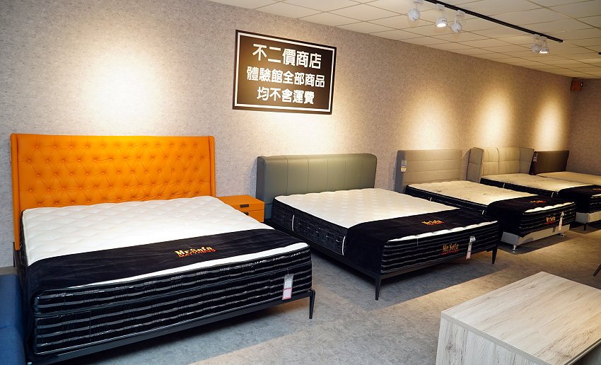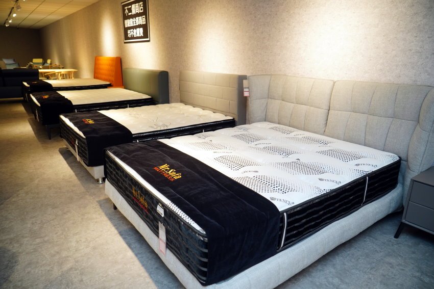 ▼除了沙發之外,這裡也有販售床墊,一共有五種不同軟硬度,不管是單人、雙人標準、雙人加大、雙人加長加大等尺寸通通都能訂製,同樣也是自家工廠生產製作,有興趣的朋友也可以試躺!