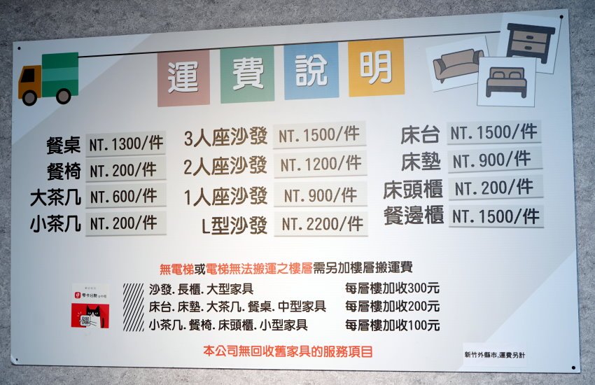▼這裡的沙發、家具通通都是不含運費,牆上也有清楚的價格說明,不會有坐地起價的疑慮,如果沒有電梯或電梯無法搬運的樓層也會加收搬運費唷!