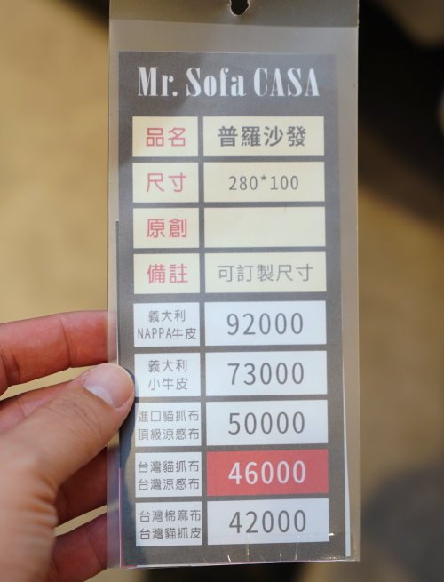 ▼這張採用的是台灣涼感貓抓布,坐起來涼爽又不用擔心家裡的寵物會不小心抓壞沙發;如果想要更換成其他沙發布或是皮質沙發也沒問題,上頭也有明確的價位!