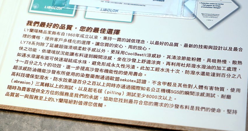 ▼這裡除了可以試坐沙發之外,也有提供客製化服務,像是沙發的長度、布料、顏色等都可以依個人喜愛來挑選,通常都會先決定好沙發款式,再來挑選布料與顏色,而這款雲端科技涼感超織布也就是貓抓布的材質,耐磨超過140000轉,也就是說磨久了也不容易脫紗,感覺就很耐用啊!