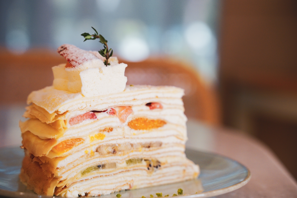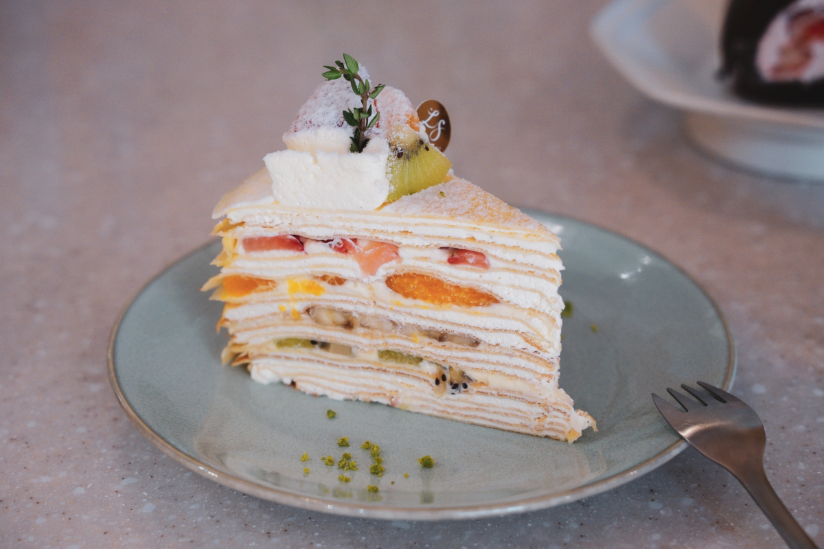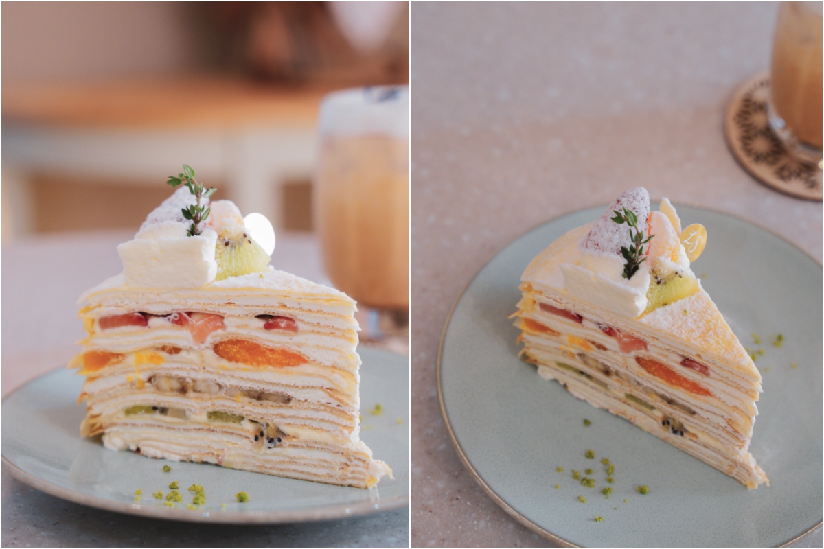 小火慢煎而成的香草千層餅皮,層層堆疊搭配當季新鮮水果,光是看著堆疊起來的千層蛋糕與水果活潑的配色就覺得療癒,一口咬下,柔軟香甜不膩口,水果原本的酸甜配上減糖後的千層餅皮絲毫不減風味,只想一口接著一口,入口即化的軟綿口感,彷若白雲緩緩飄過藍天,溫柔的流動著,讓人享受美味甜點零負擔。