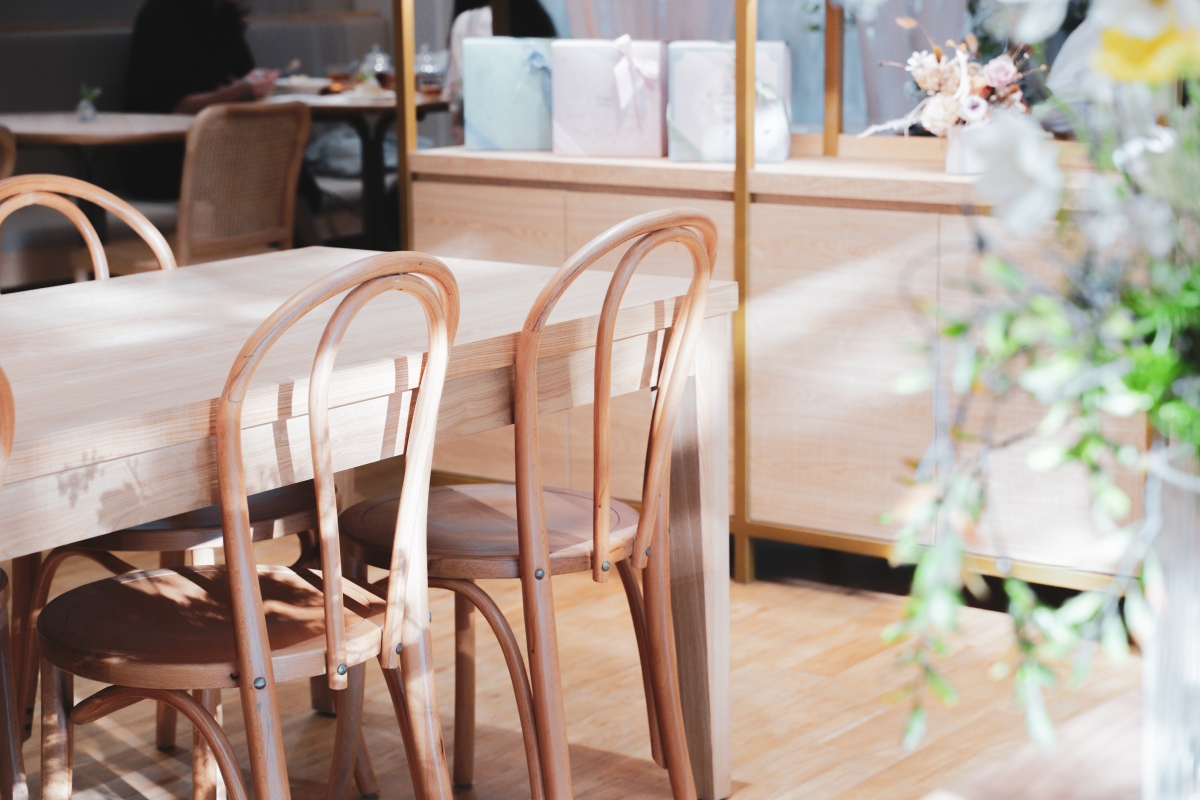 店內用餐空間優雅溫暖,奶灰色的質感空間搭配綠色植栽,時尚典雅的風格讓人難以抗拒,美好的午後時光,陽光緩緩灑落,微微透進窗前,讓人忍不住駐足停留在這好好享受一杯熱茶、一塊蛋糕。