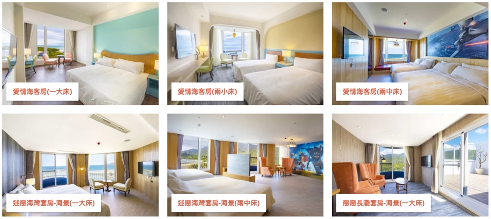 墾丁長灘休閒飯店主打親子族群,整修後共計有196間客房與套房,房型包括:愛情海客房(一大床/兩小床/兩中床)、迷戀海灘套房、戀戀長灘套房、日式客房⋯等多種房型。官網顯示最小的愛情海客房坪數是7坪,雖然現在想起來好像有點小,但實際還要等開幕入住之後才能知道空間是否足夠。