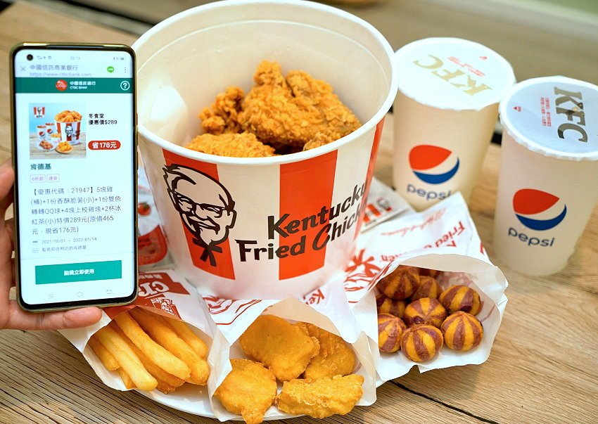▼像我們有時候會想來個邪惡的炸雞犒賞一下自己,這時候就可以來換個肯德基也不錯!用肯德基X中信ATM優惠券就能吃到5塊炸雞+1份香酥脆薯(小)+1份雙色轉轉QQ球+4塊上校雞塊+2杯冰紅茶(小),份量可以吃到2~3人,這樣一份原價465元現在只要289元,現省176元還不吃爆!!
