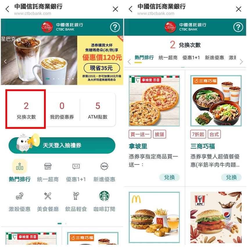 ▼加入”中國信託ATM X LINE個人化服務”並綁定帳號的話,第一次就會送你1次兌換次數,可以兌換自己想要的優惠券!之後每次提領或是轉帳也都會再送唷! 像我綁定後拿到1次,加上剛剛在中信ATM機台提款完,又送了1次,現在共有2次兌換次數!