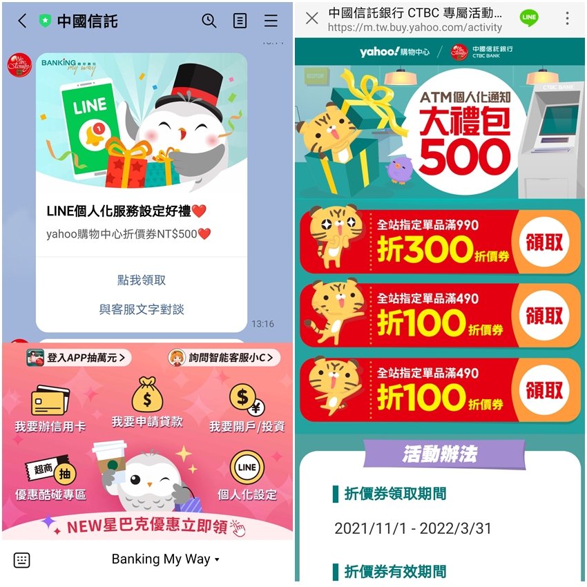 現在加入中國信託LINE使用「中信ATM X LINE個人化服務」更方便啦~不僅每次操作ATM都會送一張優惠酷碰券,而且還可以存在手機裡,不管是旅遊、美食、網購等優惠通通有,就不用收集一大疊在皮夾裡佔空間,隨時都可以用手機兌換;此外每次存、提款或是轉帳都會直接傳LINE通知你,不用印出明細也能清清楚楚,就連非中信帳戶也可以綁定,真的是超級好用啊!