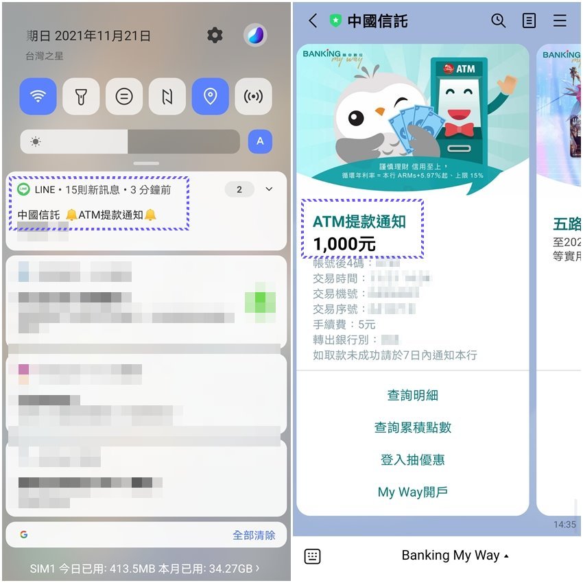 ▼而且每次提款、匯款都會傳訊息通知,也不用額外列印明細,既環保又方便,感覺挺有效率呢!