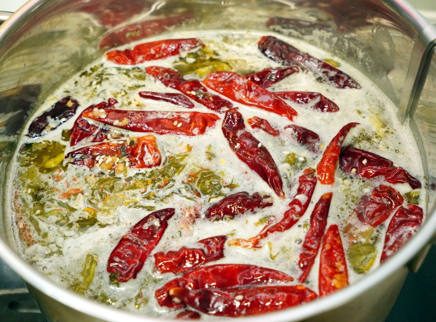▼湯頭帶點乳白色澤,搭配自製酸菜及野山椒、乾辣椒、藤椒、青花椒等多種辣椒製成的調味包,整個超夠味啊!