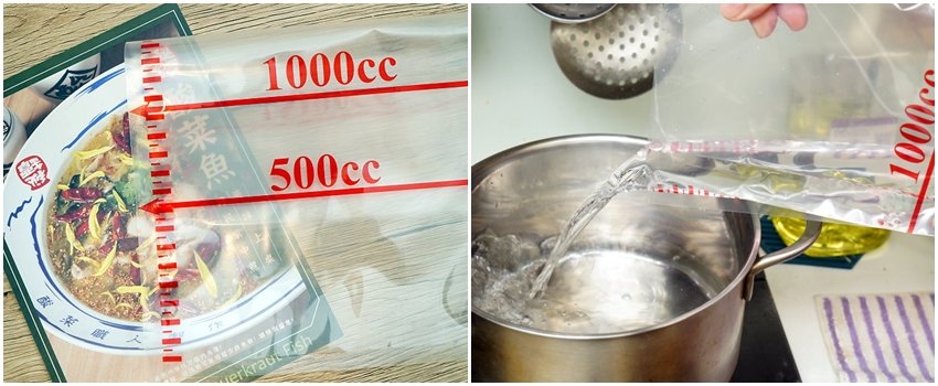 ▼內容物包括獨門醬料包、酸菜醬料包、辛香乾辣包、10 oz飽足魚片盤、陳皮洛神花茶及測量水袋,連測量用的裝水容器都不用必備,真的很貼心啊!