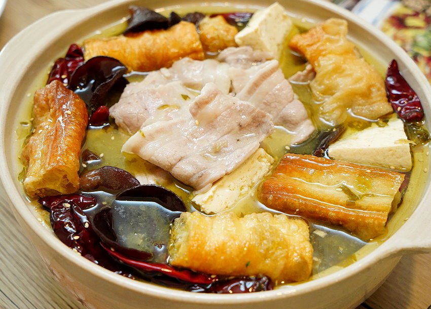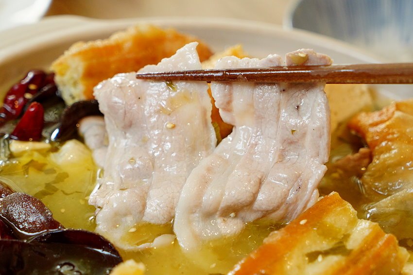 ▼酸菜魚的湯頭不僅適合涮煮魚類海鮮,連白肉也很適合~~我們特別準備了帶點厚度的豬五花,吃起來香Q厚實、酸香微辣,感覺也不這麼膩口,整個很可以!