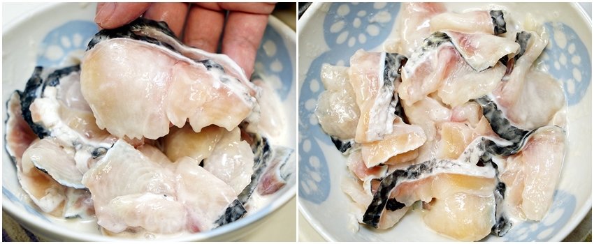 ▼魚片充分解凍後,可以加入一些蛋清、太白粉下去抓醃,等等煮出來的魚肉更加鮮嫩!