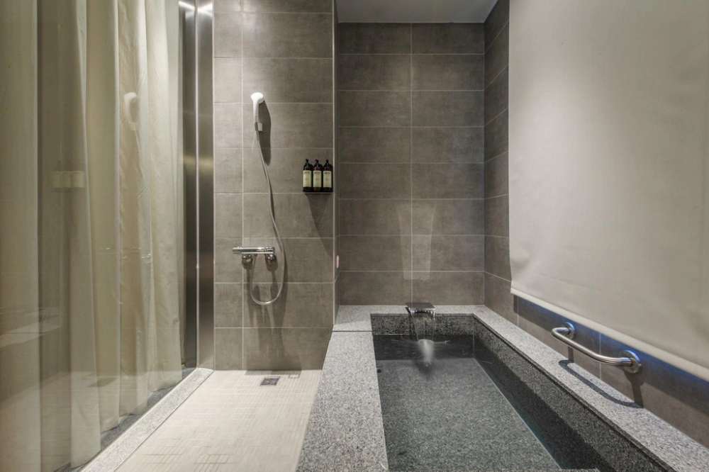 品泉雙人房、品旅雙人房整體走日系簡約風格,櫥櫃有冰箱、快煮壺、咖啡茶包、環保水瓶等用品,溫泉池足夠一個人把腳伸展開來泡,空間不大但還不至於壓迫。