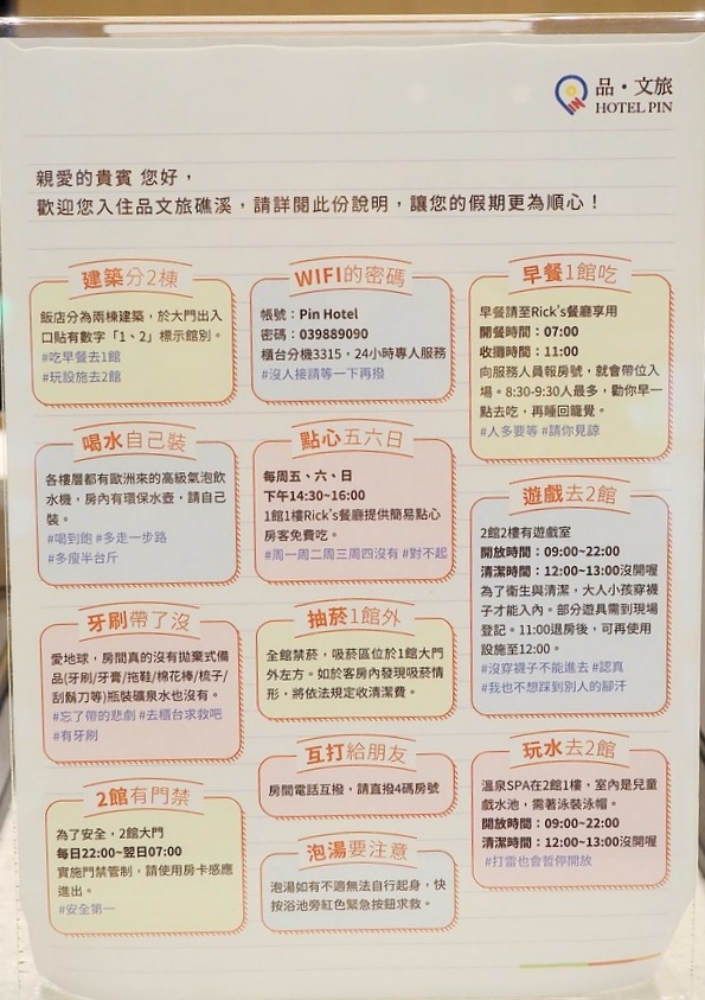 需要注意的是,品文旅是環保旅店概念,全館不提供一次性備品。包含牙刷/牙膏/刮鬍刀/室內拖鞋/梳子等都要自己準備,房間裡也沒有礦泉水(有冷水壺可以去飲水機裝),其實這樣蠻好,我現在出門玩是都習慣自己帶用得比較習慣。