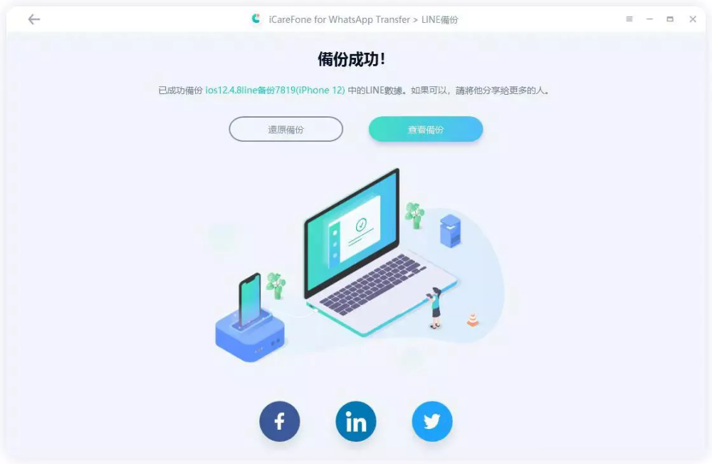 步驟 3:最後,你只需要耐心等待數分鐘,軟體就會完成 LINE 備份。當你看到以下的成功介面時,你也可以選擇要還原備份至裝置或查看備份資料。