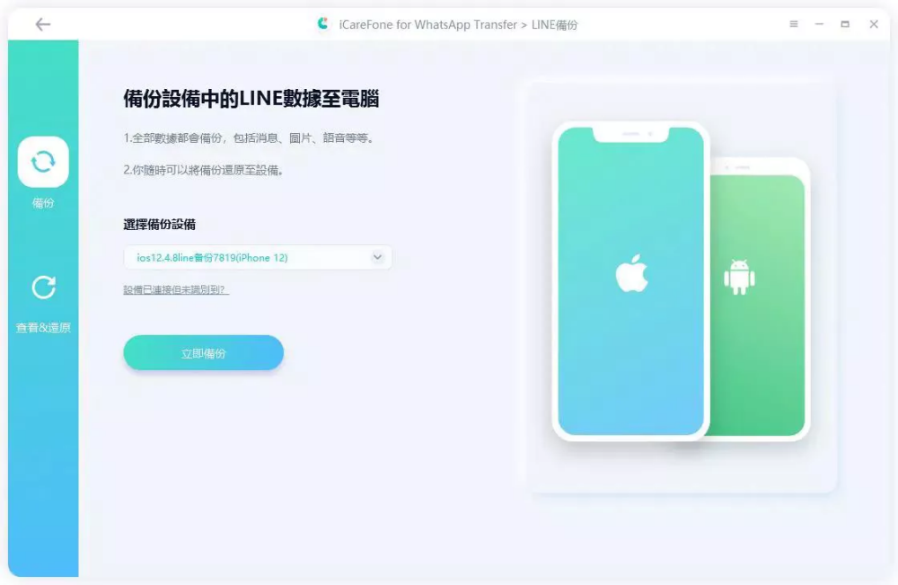 步驟 2:選擇左側的「備份」欄位,軟體會偵測到你的裝置類型。確認無誤後,點擊「立即備份」。