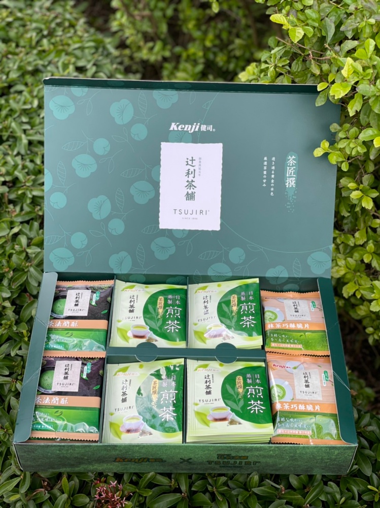 禮盒內含:日本特製煎茶40入、抹茶巧脆酥片6入、抹茶法蘭酥8入,都是由 Kenji 健司與日本百年老店辻利茶舖合作,開發出的熱賣商品,幾乎是買茶包送餅乾,CP值超高。