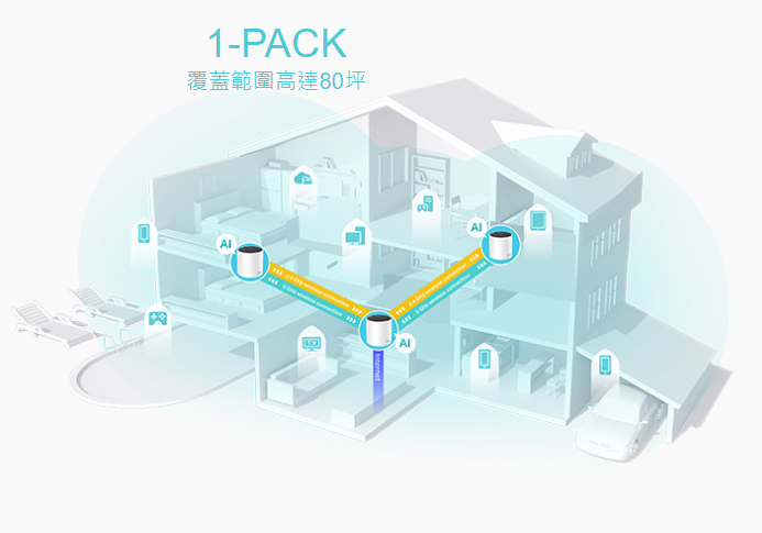 打開包裝後,TP-Link Deco X55 有著三個主機,並有附上三條電源線與一條網路線,三台主機都可以各自作為主機獨立使用,也可以當成延伸主機,沒有主機副機之分。以官方提供涵蓋範圍來說,三台主機可涵蓋約 180 坪的範圍,如果以家庭來說,4~6 房以上都不會有問題。如果家中範圍更大,你只需添購 TP-Link Deco 系列主機,不一定要同一個型號都可互相串接,適合隔間複雜或是更大坪數的住家使用。