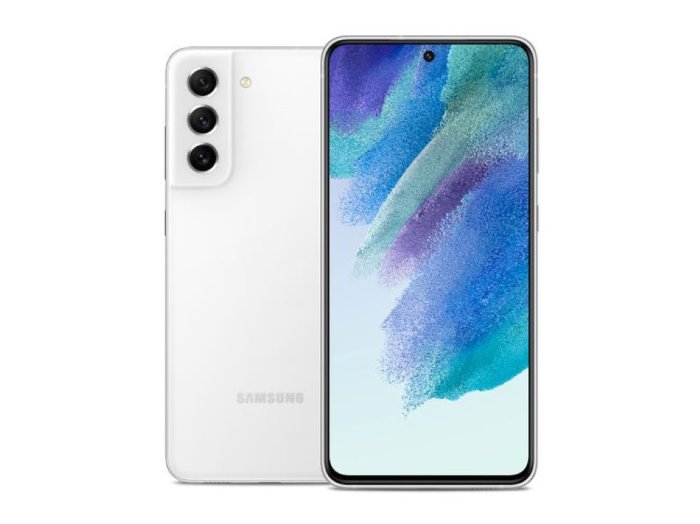 外型上,Galaxy S21 FE 繼承 S21 家族的標誌性相機設計,顏色提供黑、白、紫、橄欖綠 4 種款式。正面螢幕鏡頭為置中挖孔設計,螢幕為平面,而非曲面。