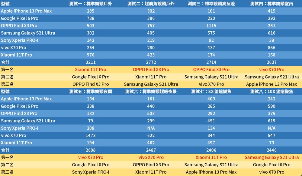 ltra、Sony Xperia PRO-I、OPPO Find X3 Pro、vivo X70 Pro 與 Xiaomi 11T Pro,共 7 款機種,並且分為 「標準鏡頭戶外日間拍攝」、「超廣角鏡頭戶外日間拍攝」、「標準鏡頭高反差拍攝」、「標準鏡頭室內食物拍攝」、「標準鏡頭一般夜間拍攝」、「標準鏡頭超級夜景模式拍攝」8 種場景來進行投票,並在稍早公佈了投票結果,究竟每個場景中網友們心中最好看的照片分別是由哪支手機拍出來的呢?又是哪款旗艦手機最多場景獲得網友們心中的 No.1 ?讓我們一起來看看!