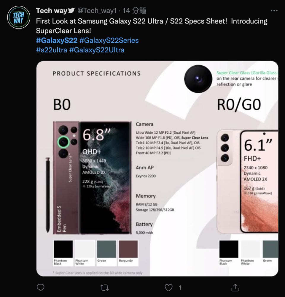 雖說顏色、外型都與傳聞的差不多,不過先不說 B0 / R0 / G0 三組代碼與之前所有消息有所不同(B0 為 Galaxy S22,並非 Galaxy S22 Ultra),以及四顆鏡頭的規格竟也與 Galaxy S21 相同,在記憶體部分,前代 Galaxy S21 分別為 12GB 和 16GB,但這規格表上卻是使用 8GB / 12GB 兩種選擇,著實很難讓人相信這會是三星為 2022 旗艦機種 Galaxy S22 所帶來的表現。