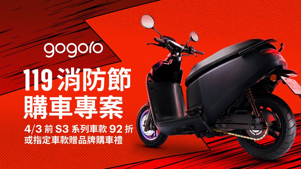 為感謝所有消防人員及無私奉獻、投身於救災救護預防工作的義消,Gogoro 自即日起至 4 月 3 日特別推出「119 消防節購車專案」,包括全體在職消防人員、行政人員和義消等工作人員,皆可享有指定車款 92 折的購車優惠,購買全系列車款加碼贈送 Gogoro 品牌風雨衣乙件,一起為辛苦守護家園的消防人員加油打氣。