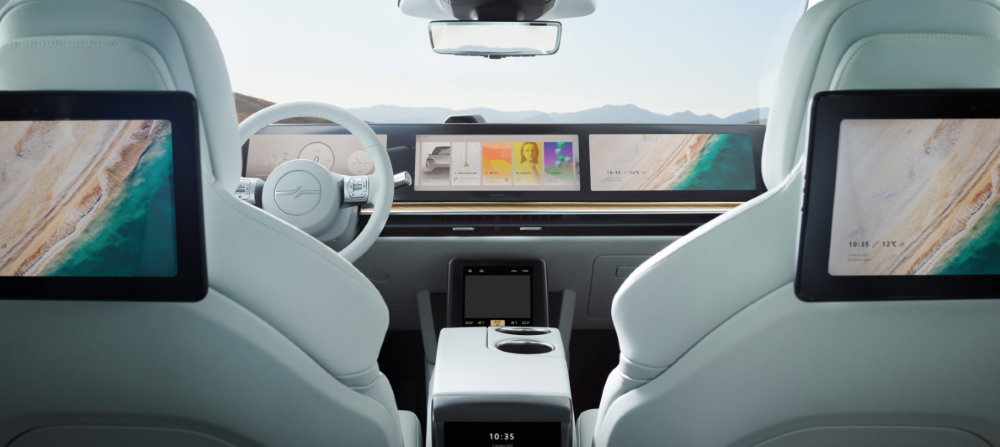 ▼ Vision-S 02 車內照,3 個顯示器一路從駕駛座延伸至副駕駛座;後方座位前的椅背也配備 2 個顯示器。乘客除了能遊玩雲端遊戲,還可以透過 5G 遠端連接家中的主機遊玩 PlayStation 遊戲。