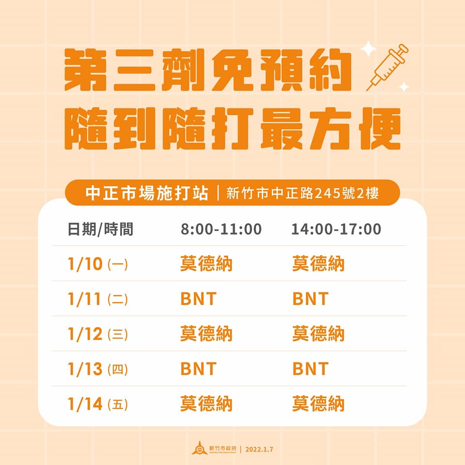 1/10 起三座疫苗站:慈濟疫苗站、體育館疫苗站、中正市場疫苗站,提供莫德納與 BNT 隨到隨打。