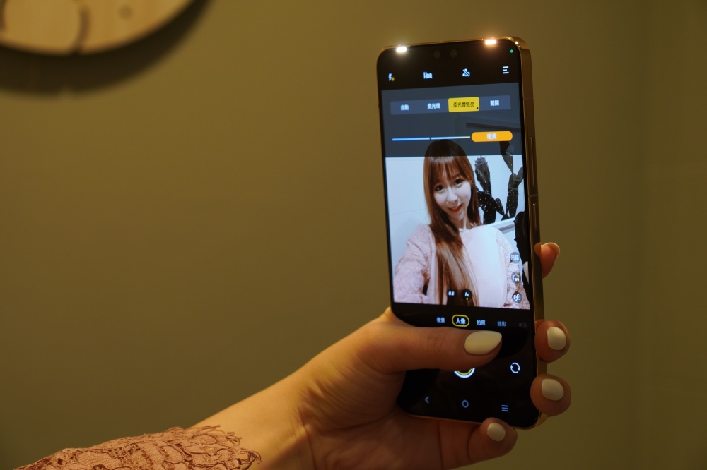 柔光燈方式則是相對少見的補光方式,透過主鏡頭兩側的燈光,在自拍時可以拍出臉部的立體感,臉部光線看起來不會太硬或太死板,能打造出自然的柔光拍攝效果。