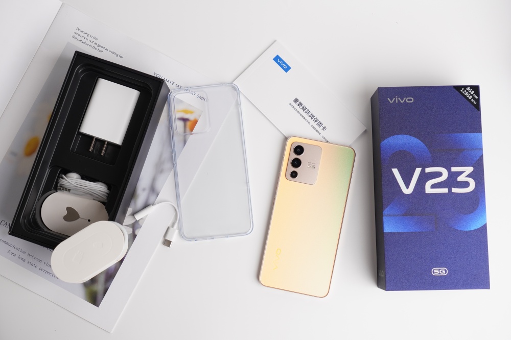 vivo V23 5G 提供的配件完整,除了手機上已經預貼好螢幕保護貼之外,還附上透明手機殼、3.5mm 耳機、3.5mm 轉 Type-C 耳機轉接線、Type-C 充電器、44W 快充充電器、退卡針等。