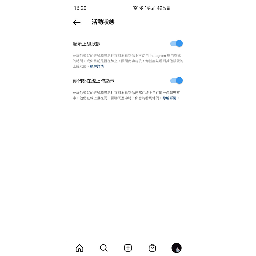 關閉此功能,不僅其他帳號無法看到你的線上狀態,你也無法看到其他人的上線狀態。