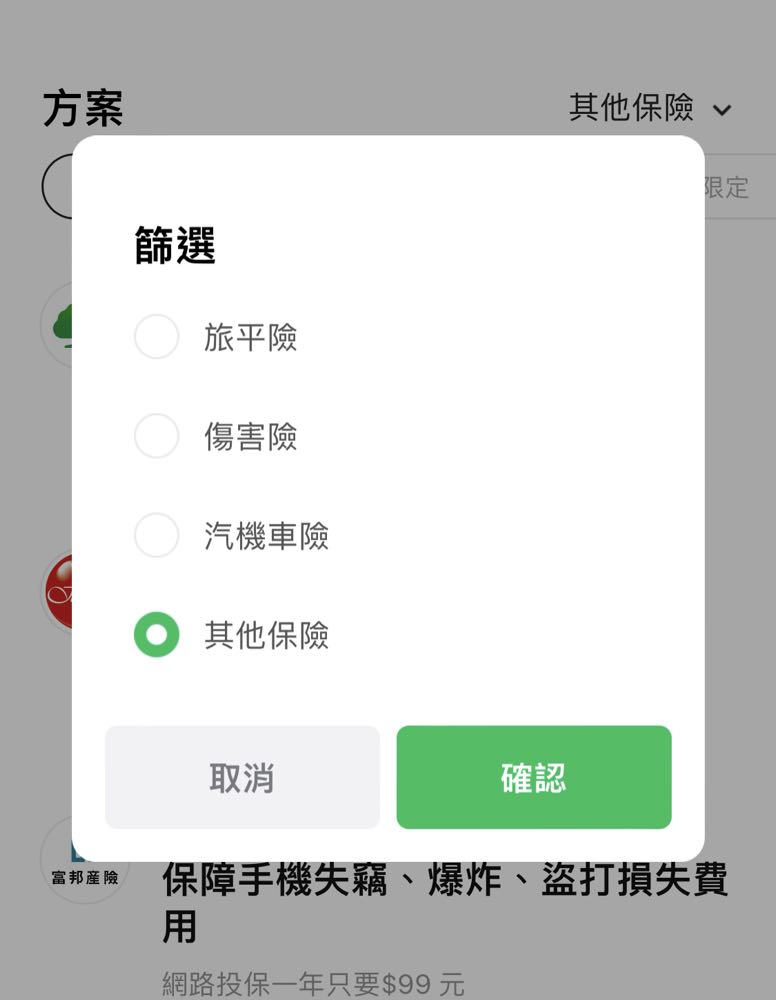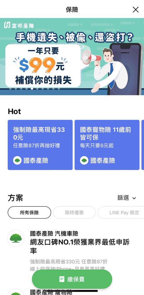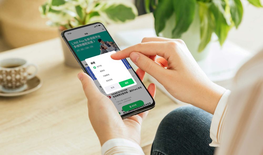 用戶打開 LINE 後就能從錢包進入 LINE Pay 首頁,再點選「保險」選項即可瀏覽合作保險公司的各種保險商品。若是不想一一找尋的話,還能夠透過「篩選」功能來直接找尋想要的方案,選定商品後便可連結至合作保險公司網站完成投保。