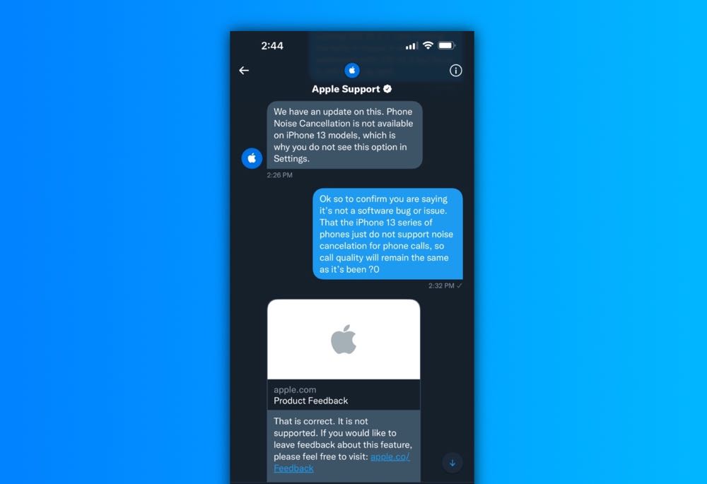 不過就有不少網友發現在 iPhone 13 系列中,卻看不到這項功能的開關,即便是更新到 iOS 15.2 後依舊是沒有出現,對此 Apple 也在與網友的回覆中證實 iPhone 13 系列的確是不支援「電話降噪」。