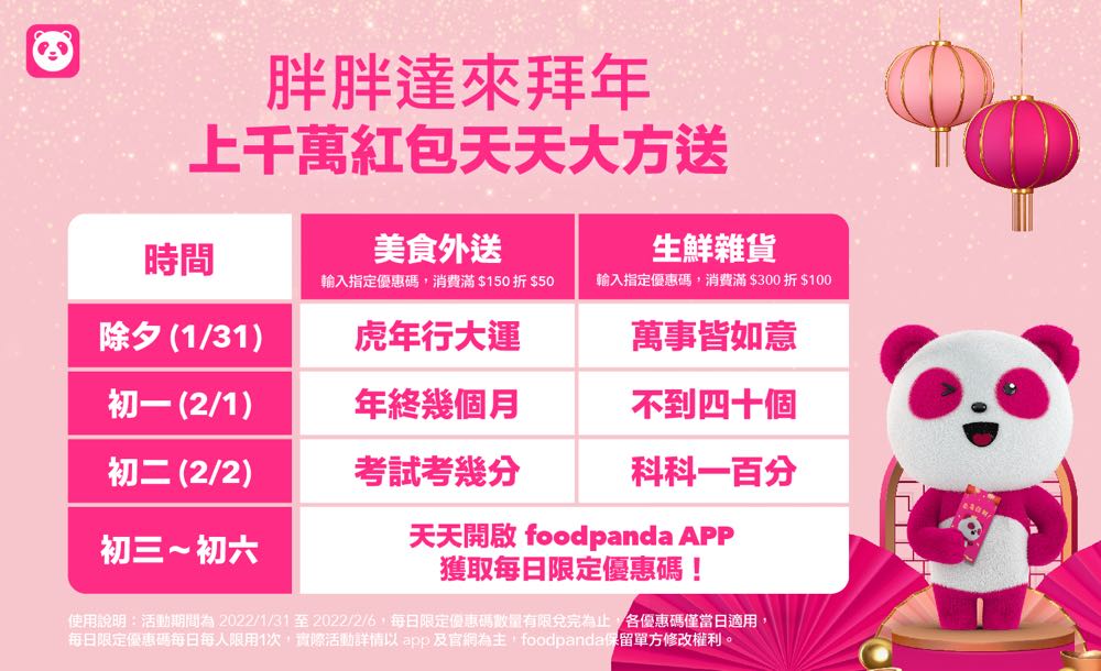 喜迎 2022 福虎年,foodpanda 推出「胖胖達來拜年」賀歲強檔活動,千萬紅包天天大方送!從除夕到初六 ( 1 月 31 日至 2 月 6 日),每天祭出各一組美食外送、生鮮雜貨的限定優惠碼。今年還將吉祥話、長輩問候語等都變成優惠碼,凡輸入指定優惠碼,即享美食外送消費滿 $150 折 $50,生鮮雜貨消費滿 $300 折 $100 的超值優惠,一連七天限時限量、天天瘋搶,總計將狂撒破千萬美食金!