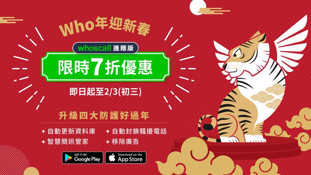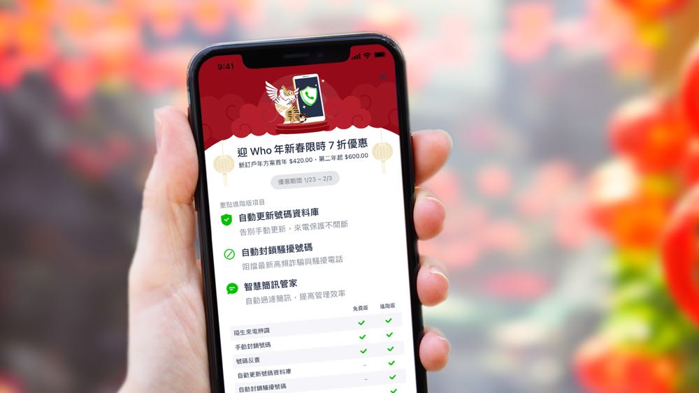 隨著農曆新年的到來,Whoscall 為防止詐騙電話與簡訊在春節期間作亂,自即日起至 2 月 3 日在 Apple Store 與 Google Play 同步推出「迎 Who年新春限時優惠」,提供首次訂閱 Whoscall 進階版的用戶在首年享有 7 折優惠,每月只要 35 元,相當於一杯手搖飲料的價格就能享有 Whoscall 四大防護功能。
