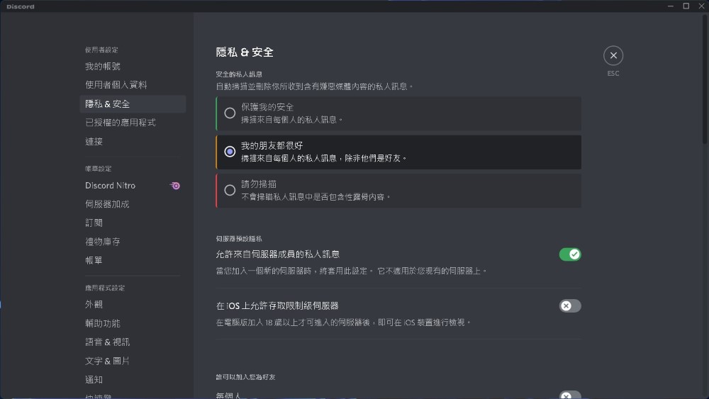 此外,你也可以限制陌生人加你好友,同樣是在「隱私&安全」頁面,下方找到「誰可以加入您為好友」項目,有三種選項:每個人、好友的朋友、伺服器成員。