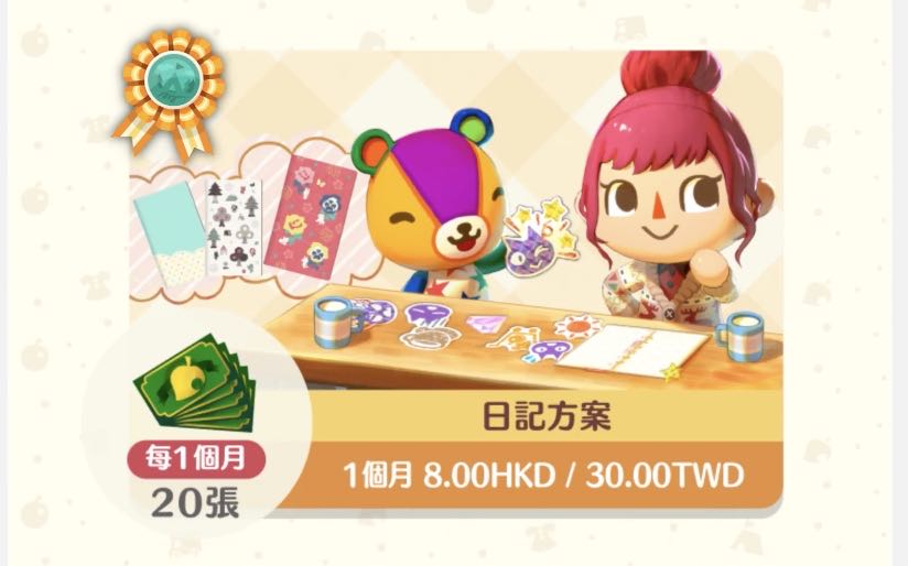 最後是遊戲中會加入日記,有著活動行程以及與動物們的對話,並且還能貼貼紙做設計。官方還有提供付費的日記方案,每個月僅要台幣 $30 元,便能獲得 20 個葉子幣與更多日記頁面設計、貼紙造型等。